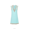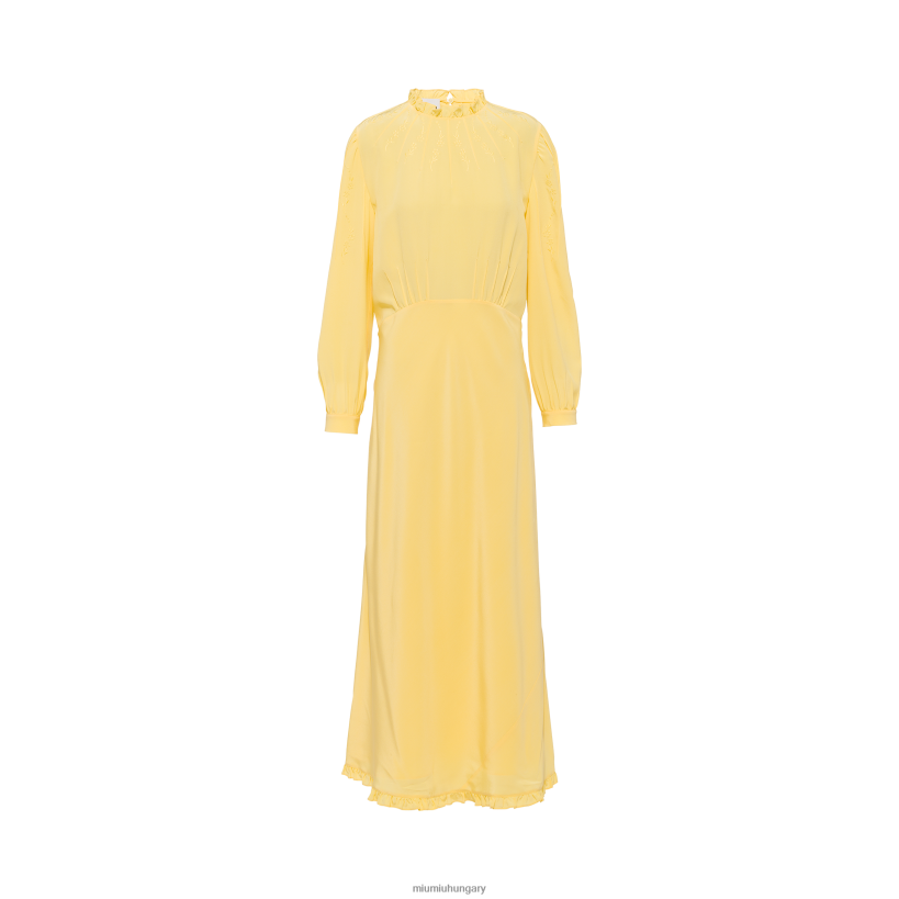 A klasszikus eleganciát felborítják, és a nőiességet a Miu Miu tiszteletlen lencséjén látják. A könnyű krepp folyadék sziluettje ezt a hosszú ruhát finomított részletekkel jellemzi: A romantikus ringing a szegélyt és a nyakkivágást díszíti, míg az íj a derékot hangsúlyozza. li> hosszú sziluett