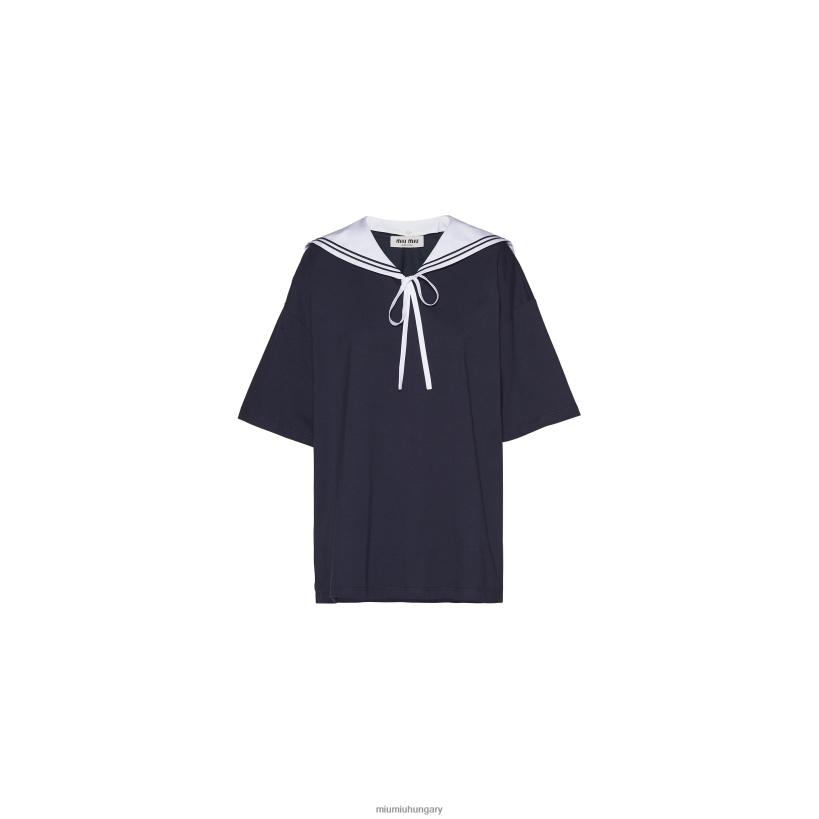 A tengeri világ hivatkozásai találkoznak Miu Miu tiszteletlen nőiességével ebben az új pamut pólóban. A klasszikus Sailor gallér csíkokkal és íjba kötött húrokkal, magával ragadó részleteket és kifinomult színű kontrasztot vezet be a ruhadarabon. A hímzett logó kiemelkedik a gallér hátsó szélén, és ikonikus megjegyzéssel tölti be a formatervezést.