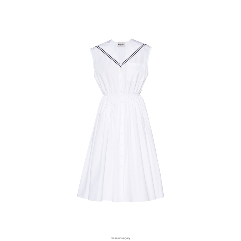 A tengeri világ hivatkozásai találkoznak Miu Miu tiszteletlen nőiességével az új Sailor Poplin ruhában. A klasszikus tengerész gallér kontrasztos csíkokkal és az elasztikus derék sportos karakterrel határozza meg a magával ragadó és innovatív esztétikát. A hímzett logó kiemelkedik a gallér hátsó szélén, és ikonikus megjegyzéssel tölti be a formatervezést. li>