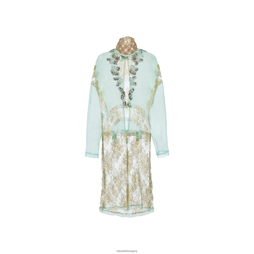 A női szekrények tanulmányozása a luxust és a lázadást. A Miu Miu újraképezi a klasszikus ruhákat, keverve az innovatív szabást és a képzett know-how-t. Az értékes hímzés megvilágítja ennek a csipke ruhának a gallérját egy organza betétekkel díszített folyadék sziluetttel.