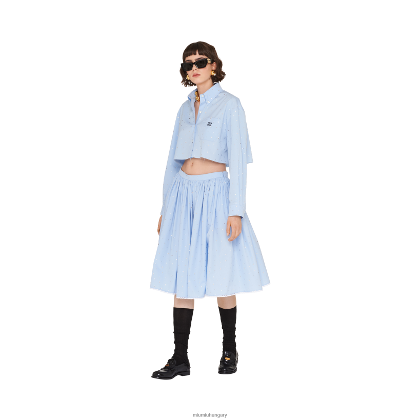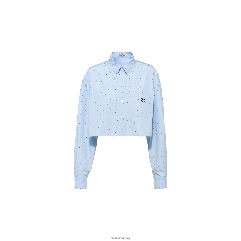 A friss egyszerűség a szartorális ihletésű ruhadarabokká alakul, amelyeket az új szezonra újraképzeltek a tiszteletlen sziluettekben. Ennek a kivágott ingnek hibrid kialakítása van, amelyet egy sportos szekrény ihlette, amelyet újraértelmeznek az Audacity -val. A Miu Miu logóval díszített ruhadarabot finoman díszítik, elegáns, teljes átmenő motívummal. > ing gallér