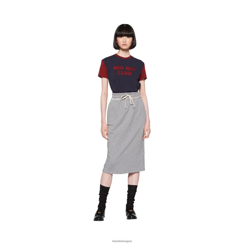 A sportruházat megfelel a lázadó Miu Miu Soul -nak az új pamut gyapjú szoknyájában. Az egyenes, karcsú vonalakat a rugalmas húzóstrukciós derék és a hímzett logó hangsúlyozza, amely váratlan megkülönböztető érintéssel tölti be a ruhadarab esztétikáját. Egyenes illeszkedés
