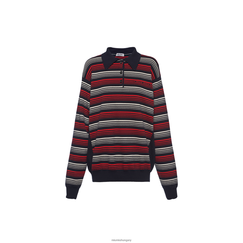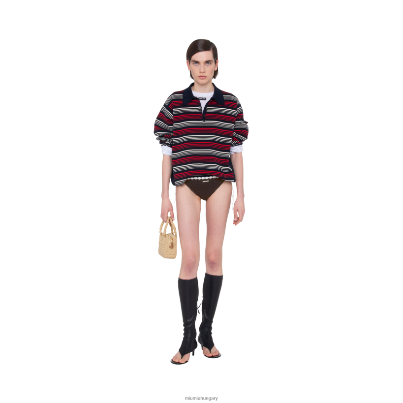 A férfi ruházat referenciáit újraértelmezik a Miu Miu tiszteletlen nőiessége szerint ebben a pamut kötött pólóban. Színes csíkok élénk részleteket adnak a ruhadarabhoz, míg az Intarsia logó ikonikus és megkülönböztető hangon fejezi be a megjelenést.