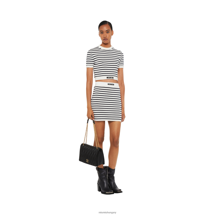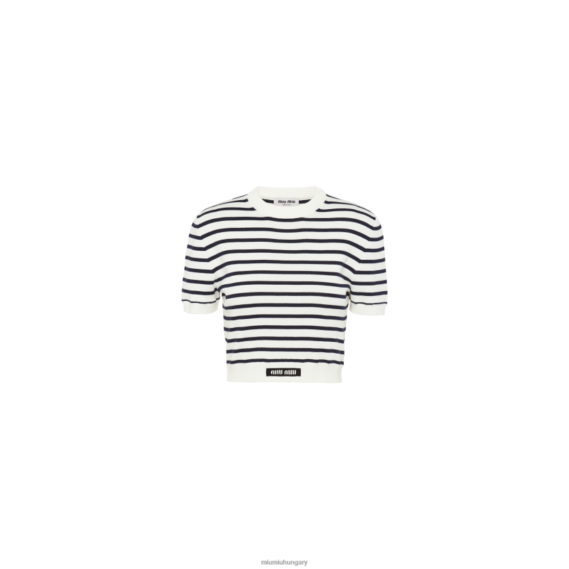 A Csíkok Világa megfelel a Miu Miu provokatív karakterének ebben az új pamut legénység-nyakú pulóverben. A kivágott vonalakat bordázott kötött díszítés kíséri, és kortárs megjelenést kölcsönöz a ruhadarabnak. Az intarsia logó kontrasztos színű, a szegélyen egy ikonikus megjegyzéssel tölti be a formatervezést.