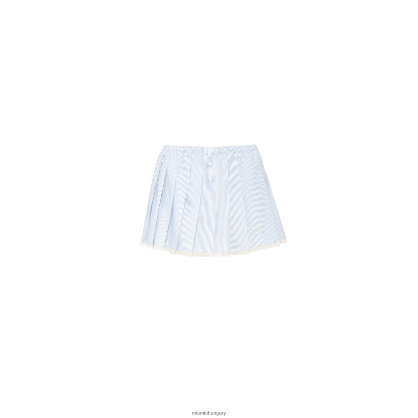 Miu Miu A poplin -miniszoknya túlzott és karizmatikus nőiessége megjelenik. A hímzett logó finomított kontrasztot vezet be, és megkülönböztető, ikonikus megjegyzéssel fejezi be a formatervezést.