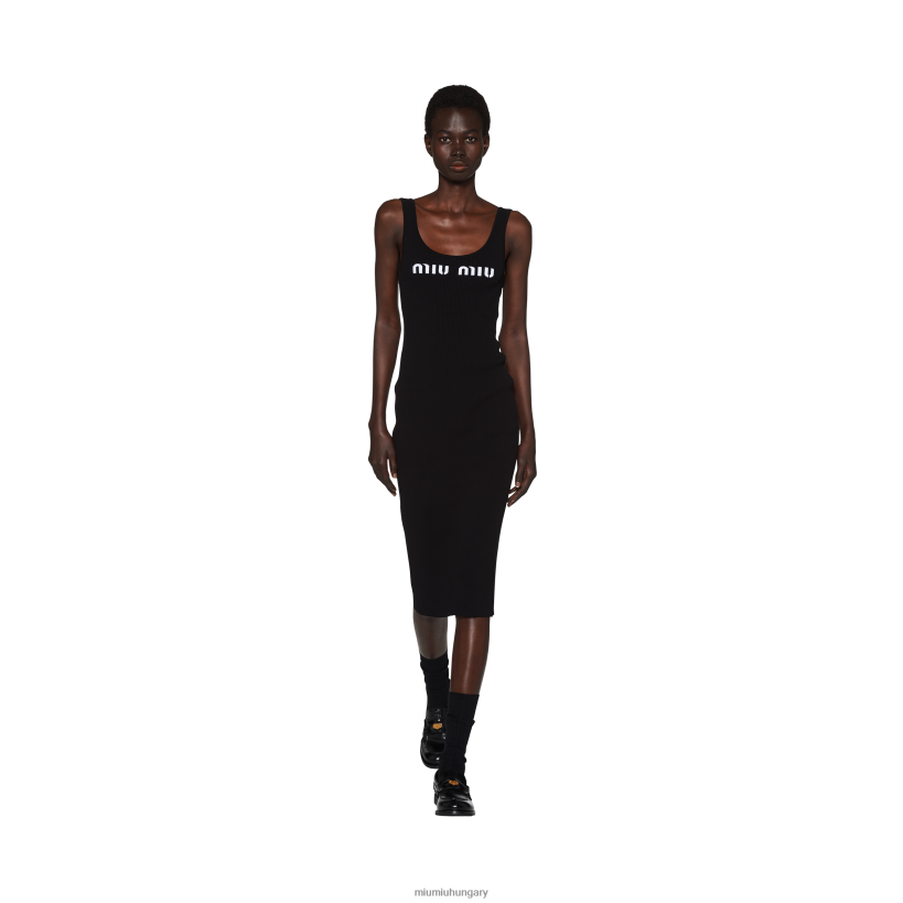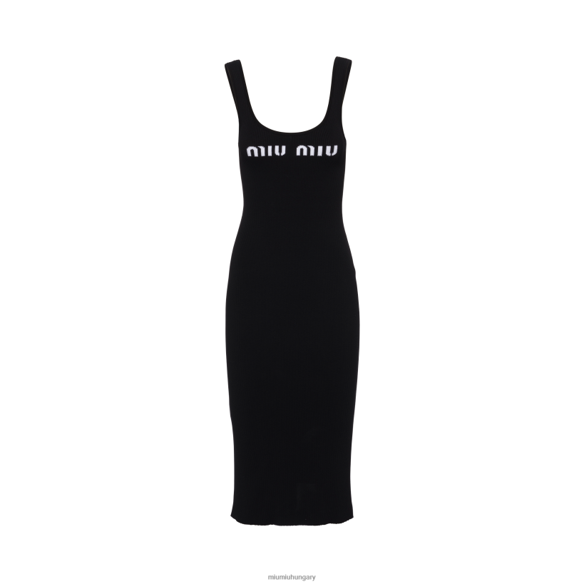 Miu Miu merész, ikonikus stílusa kíséri az új ruha megjelenését és karcsú vonalait. A hüvelyruhát, amely általában a formális eleganciának szinonimája, sportos hangulatot kap a bordázott kötésnek köszönhetően, amely a ruhadarabot lefedi, míg az intarsia logó kontrasztos színben megkülönböztető érintést jelent.